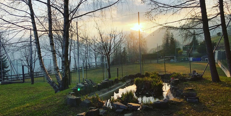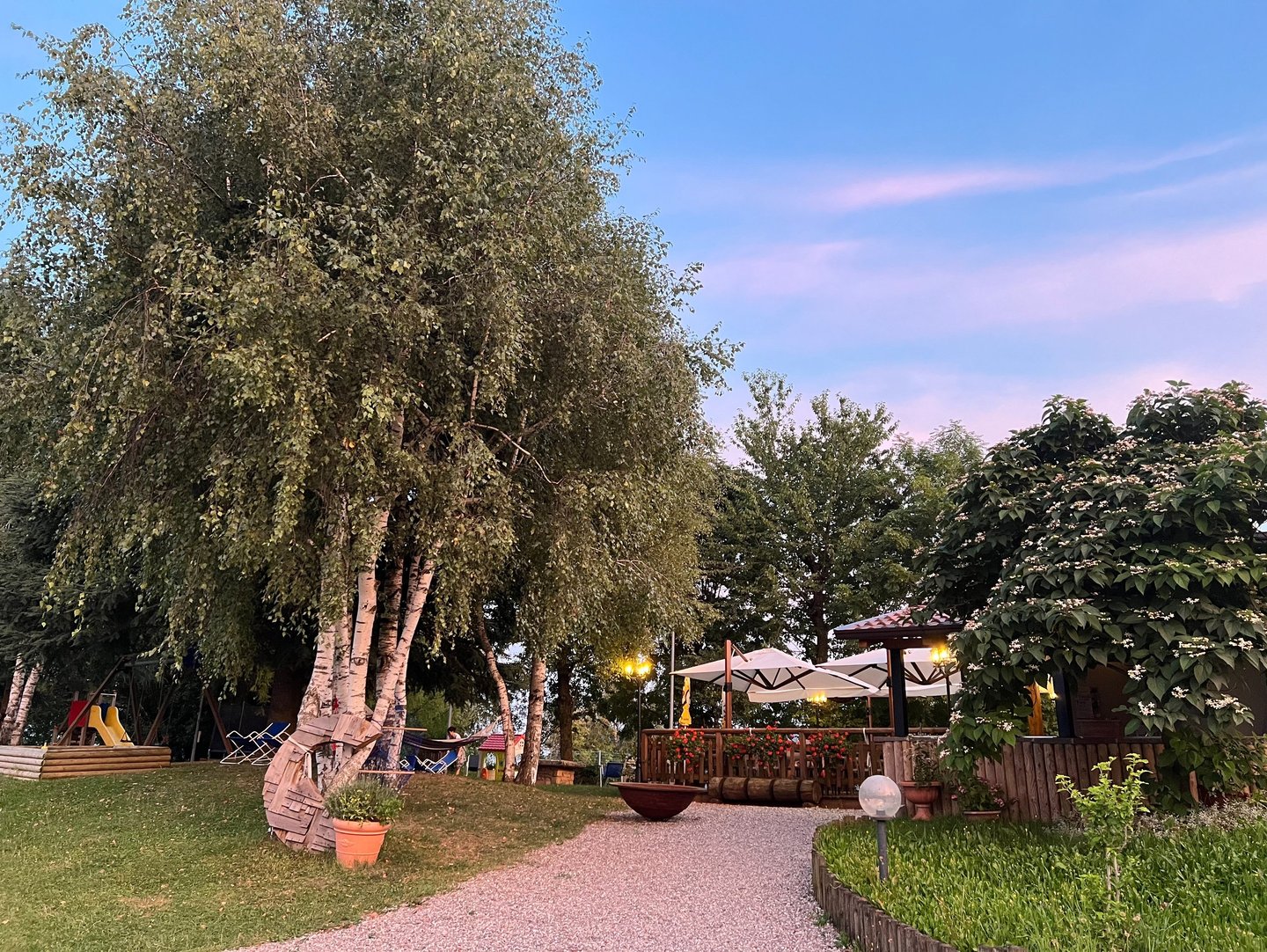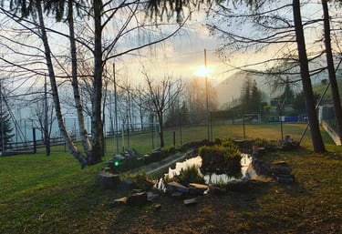 Un vasto giardino con diversi esemplari di piante, un piccolo stagno, un' area pic-nic. Un parco giochi per i più piccoli proprio davanti alla nostra terrazza e un campo da calcio con spogliatoi per divertimento all'aperto.